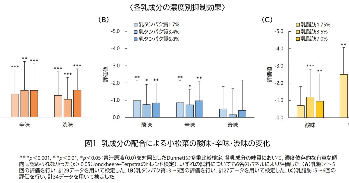 ・乳製品に含まれる乳糖、乳タンパク質、乳脂肪が、それぞれ小松菜の酸味、辛味、渋味の抑制に寄与する。