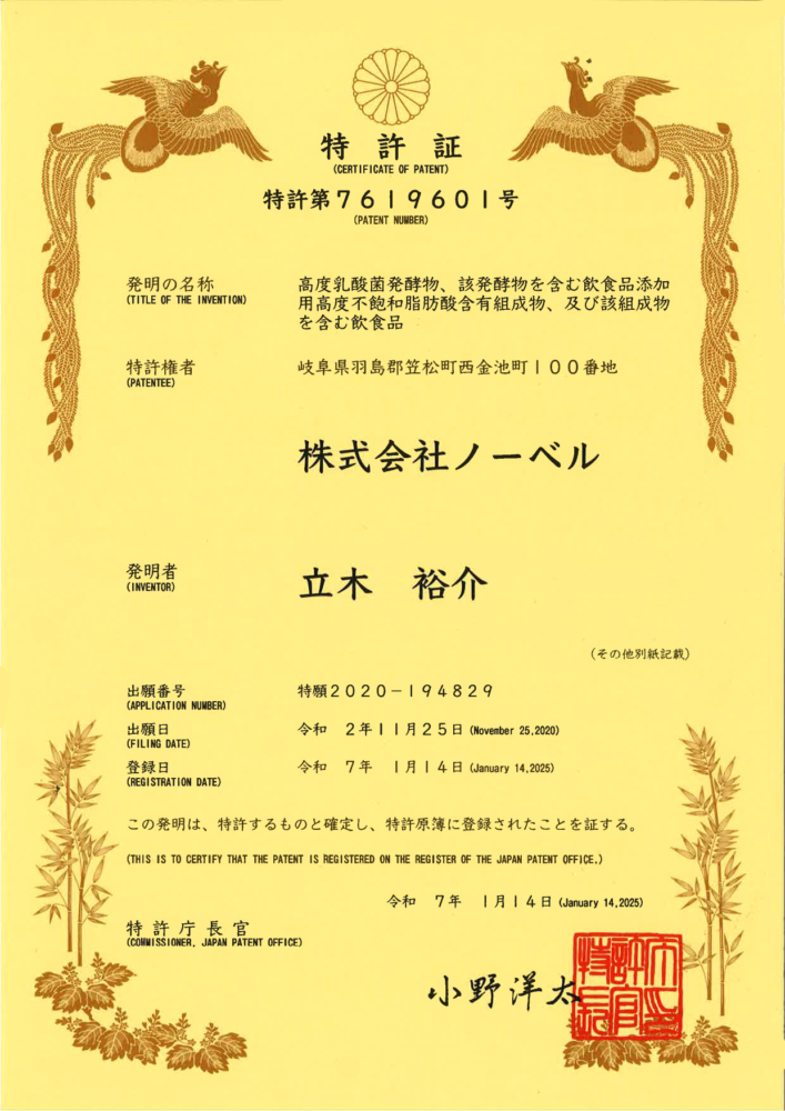 株式会社ノーベルは特許を取得しましたのでお知らせします。