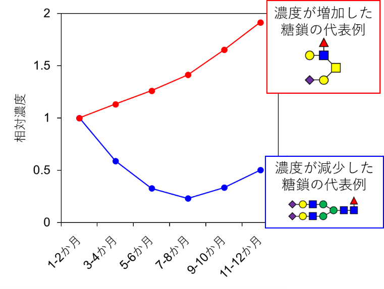 出産後の日数に伴い、大半の糖たんぱく質糖鎖は濃度が減少しましたが、一部の糖たんぱく質糖鎖は逆に濃度が上昇するなど、糖たんぱく質糖鎖の種類によって異なる濃度変化パターンを示すことを見出しました。