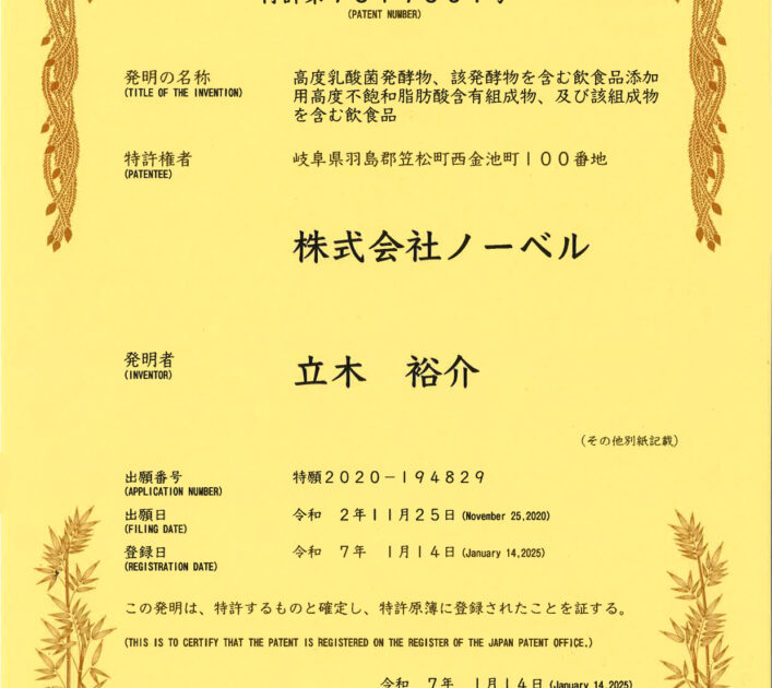 特許取得のお知らせ 株式会社ノーベルは特許を取得しましたのでお知らせします。 ■特許番号:第7619601号 詳しくは特許情報プラットフォームをご覧ください。 ■特許登録日:令和7年1月14日 ■発明の名称:高度乳酸菌 […]